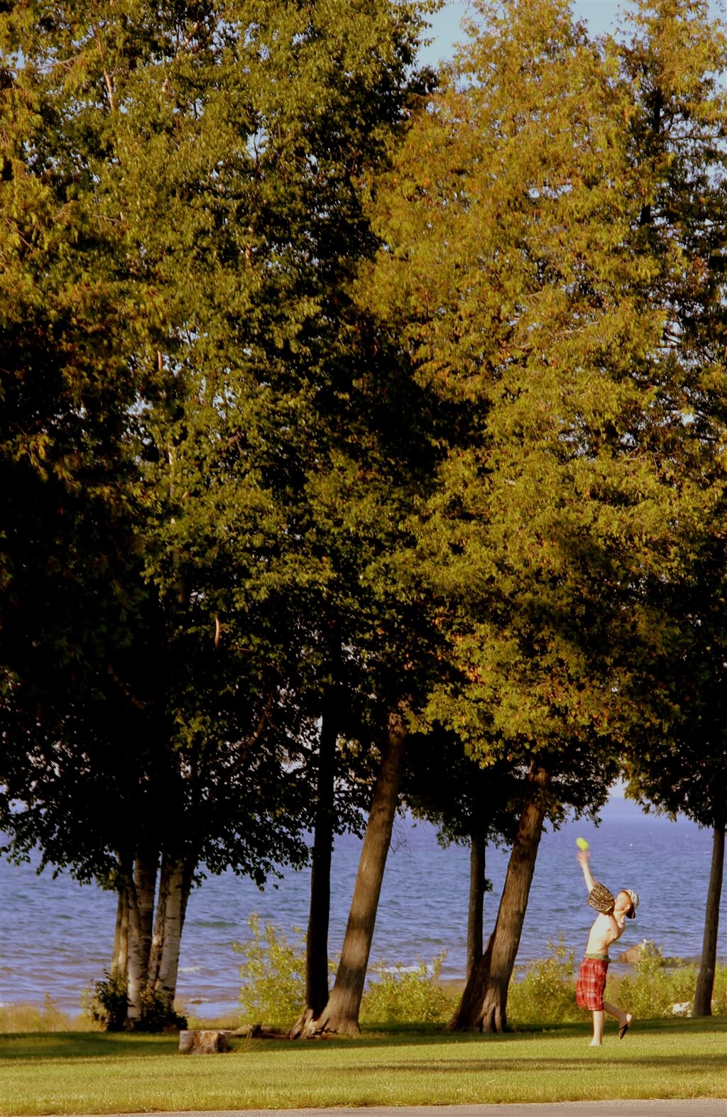 Back at the campground, this young man catches a high fly ball on the shores of Lake Huron. Much of the lake shore at Mackinaw Mill Creek Camping has been preserved as a green area for all campers to share and enjoy.